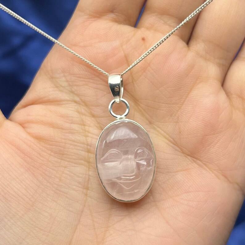 925 Sterling Silver Bohemian Style Moon Face Pendant Rose Quartz Gemstone Rhodium Gold Plated Handmade Statement Jewelry Charms