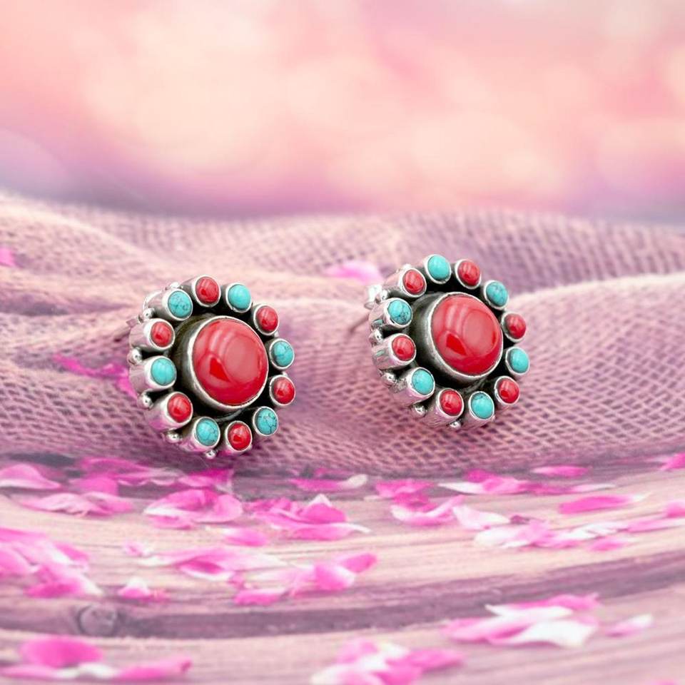 925 Sterling Silver Boho Stud Earrings Natural Multi-Color Coral & Turquoise Fashionable Elegant Wedding Gift Jewelry