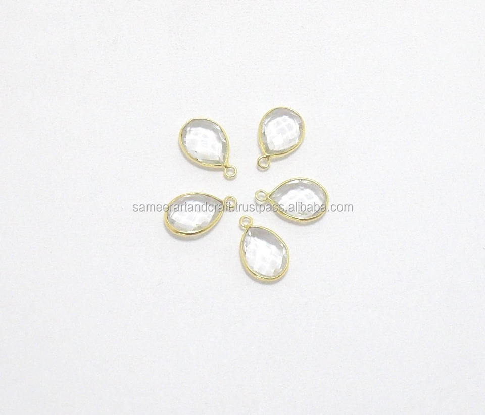 925 Sterling Silver Clear Crystal Quartz Gemstone with Gold Plated Faceted Bezel Connector for Jewelry Making Accessories