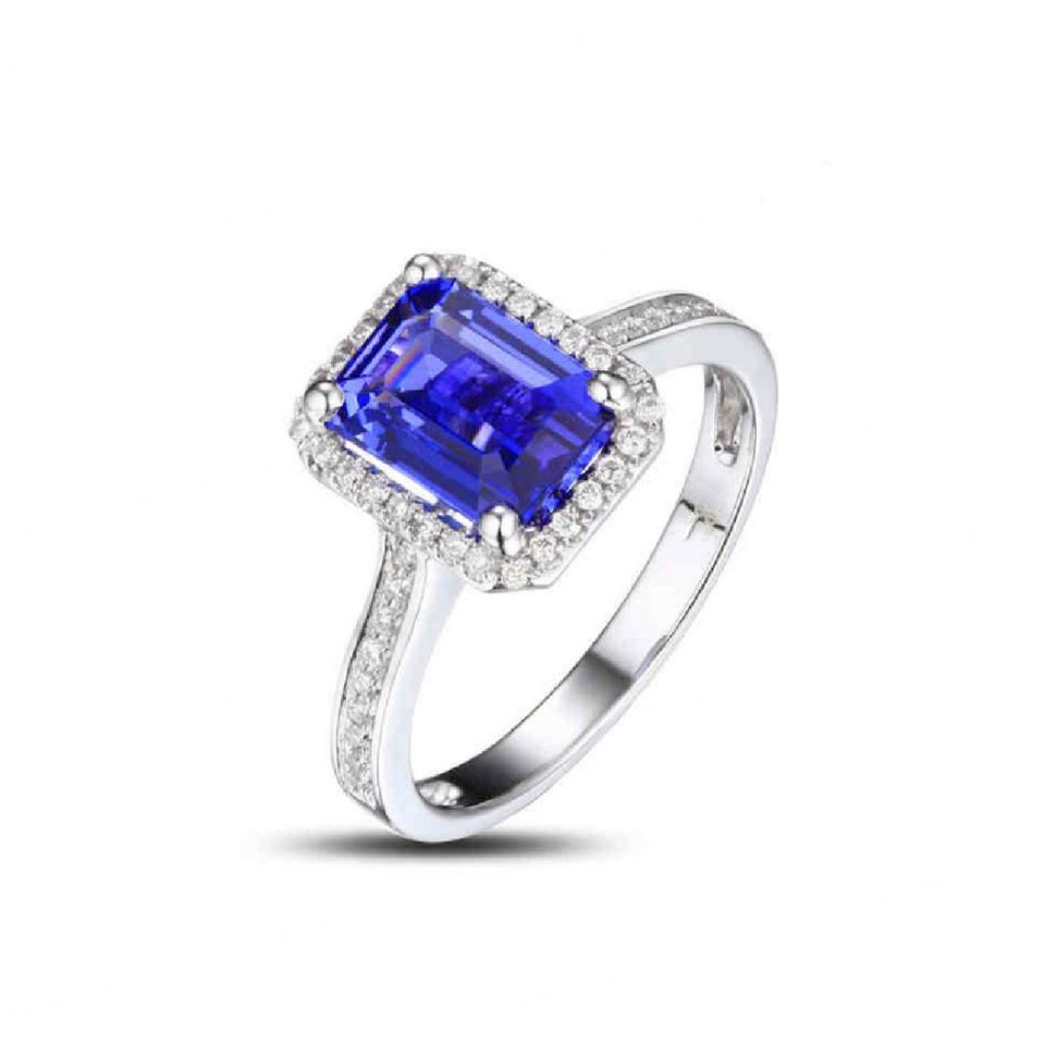 925 Sterling Silver Cubic Zircon CZ Halo Diamond Emerald Cut Tanzanite Engagement Ring