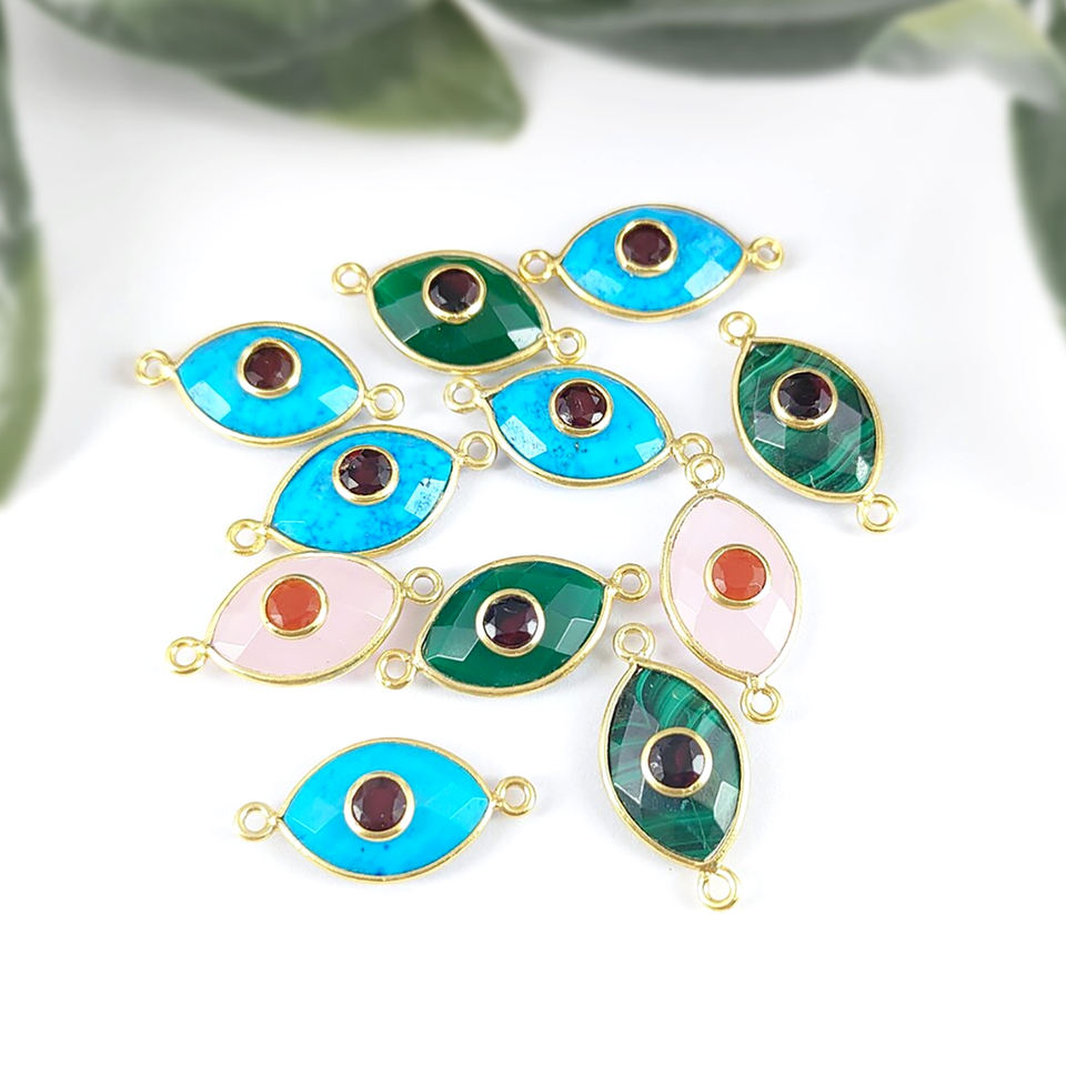 925 Sterling Silver DIY Evil Eye Inlay Peridot Gemstone Charm Connector Gold Plated Marquise Bezel Charm Connector for Bracelet