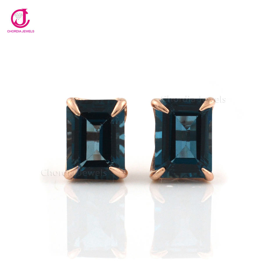 Fashion Jewelry Women Rose Gold 925 Sterling Silver Stud With 7X5MM Octagon Cut London Blue Topaz Gemstone Earrings Wholesale