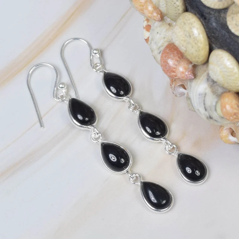 925 Sterling Silver Elegant Hook Earrings Handmade Black Onyx Gemstone 3 Stone Hoop Jewelry Gift for Women Wholesale Supplier