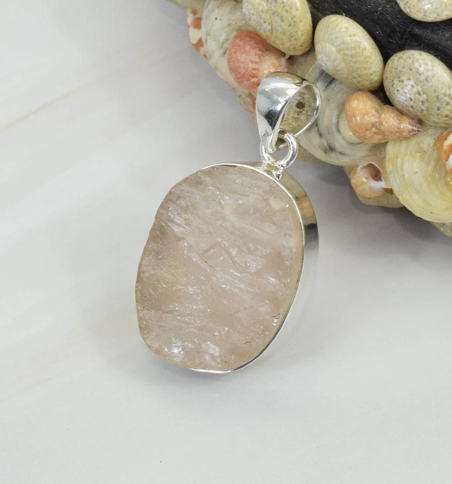 925 Sterling Silver Elegant Pendant Handmade Oval Rose Quartz Gemstone Rough Pink Color for Christmas Gift Crystal Jewelry