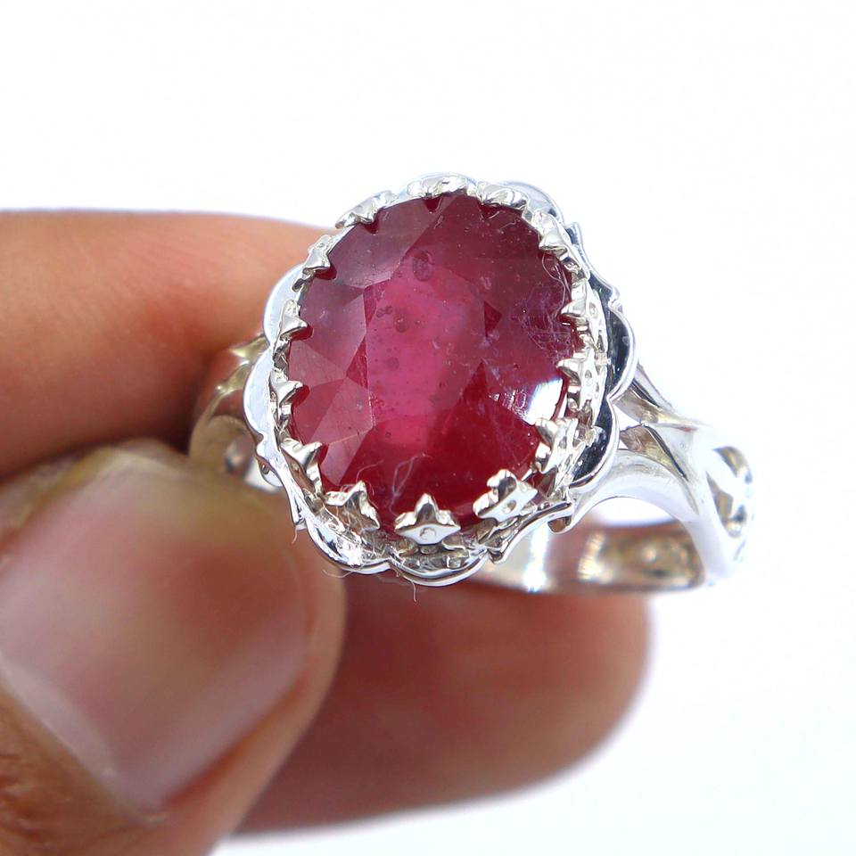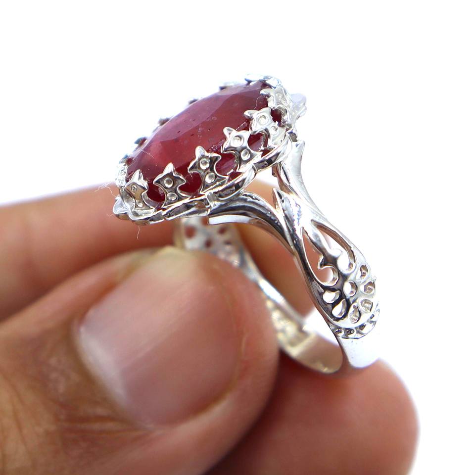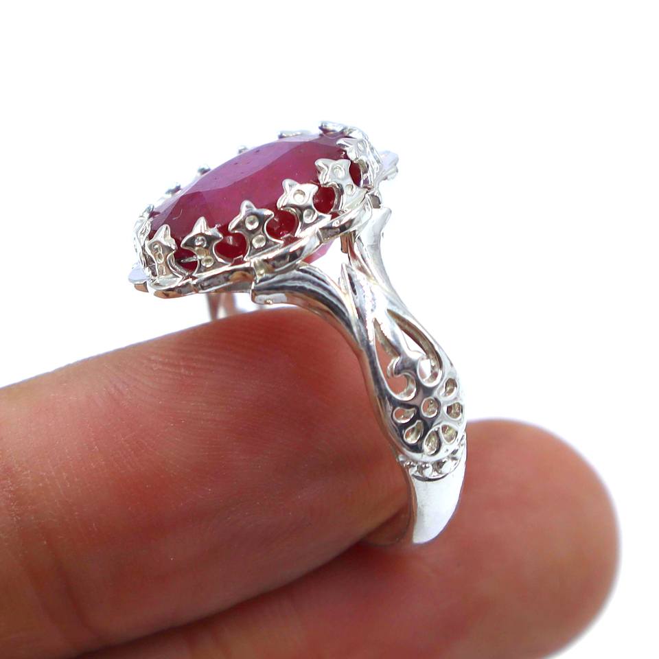 925 Sterling Silver Faceted Cut Oval Shape Statement Ring with Ruby Sapphire Gemstones Bezel Setting for Weddings or Parties