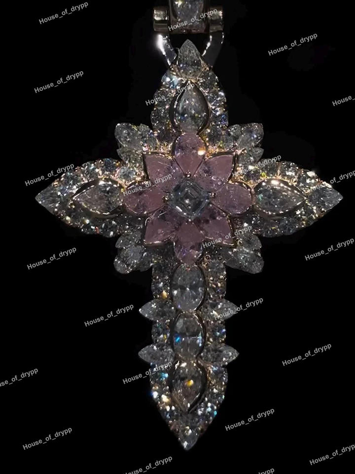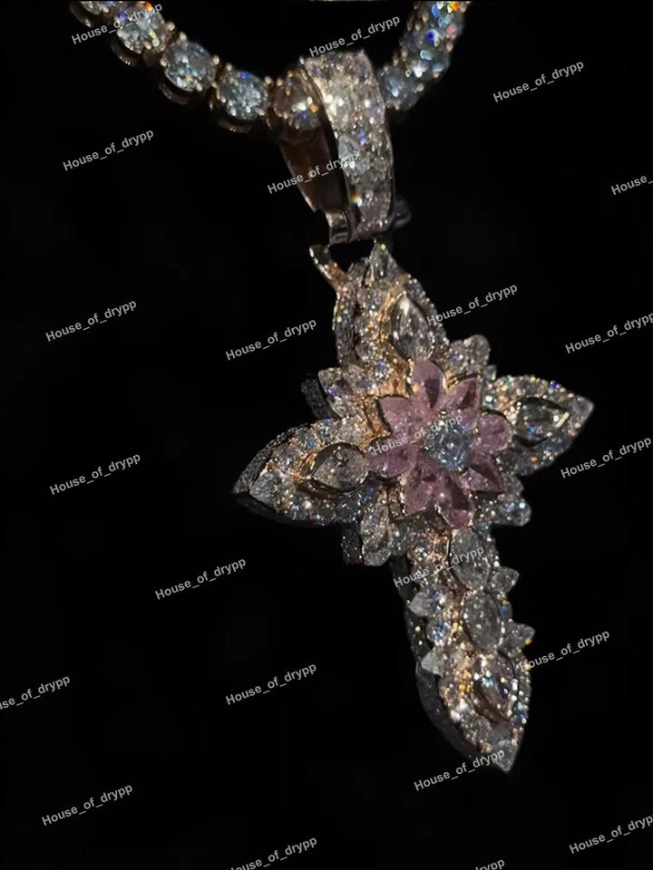 925 Sterling Silver Floral Cross Pendant Pink Moissanite Diamond Look Iced Out Hip Hop Religious Statement Pendant