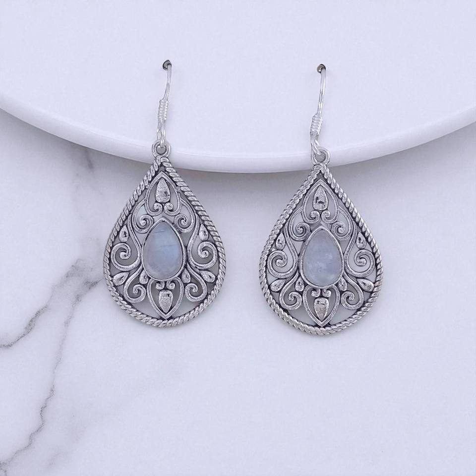 Natural Bezel Set Moonstone And Rose Quartz Pear Shape Popular Hot Hoop Earring In Sterling Silver Earring for Woman and Girls