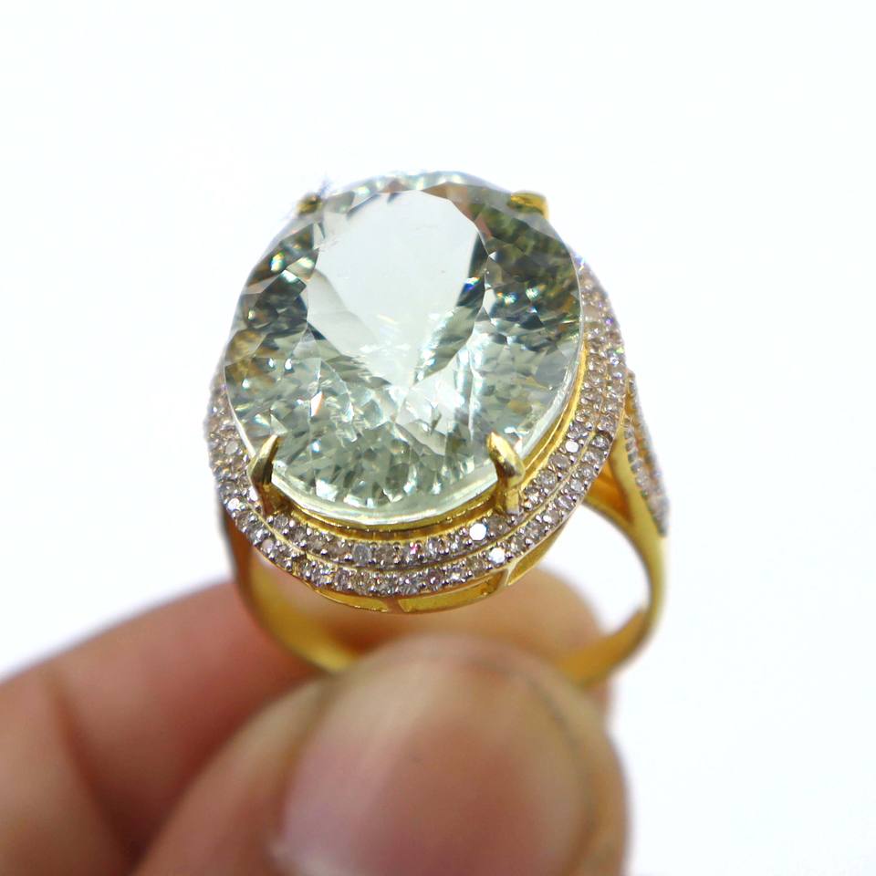 925 Sterling Silver Gold Plated Ring Natural Green Amethyst & Diamond Ring Gemstone Gift Ring Jewelry Womens