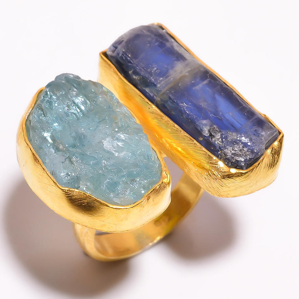 925 Sterling Silver Gold Plated Ring, Natural Green Kyanite, Rose Quartz Gemstone Gold Plated Ring, Handmade Silver Jewelry