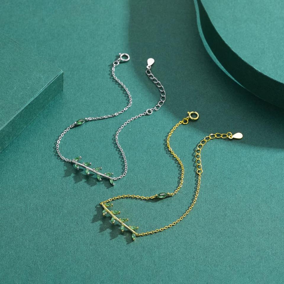 925 Sterling Silver Gold Plated Trendy Green Leaf Zircon Adjustable Link Charm Bracelet for Unisex Anniversary Jewelry