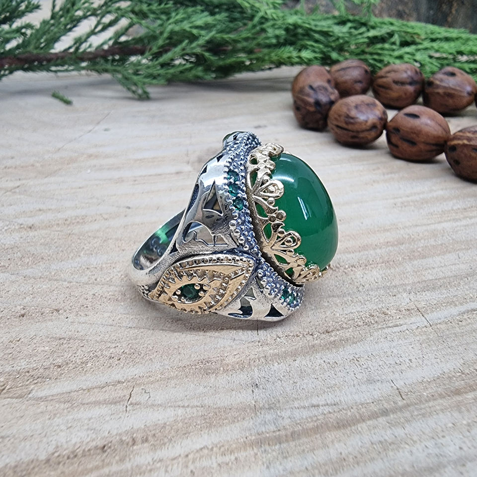 925 Sterling Silver Green Agate Men Ring Turkish Ring for Men Ottoman Arabic Trendy Ring Accessories Gift for Man Traditional