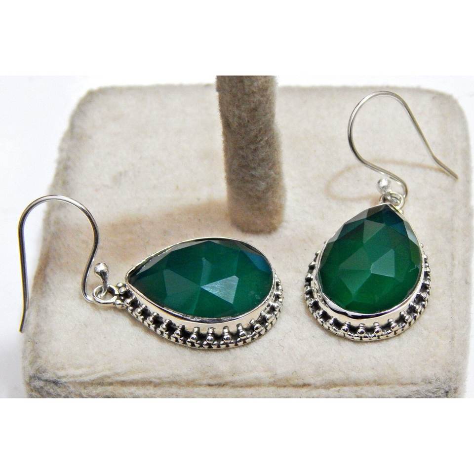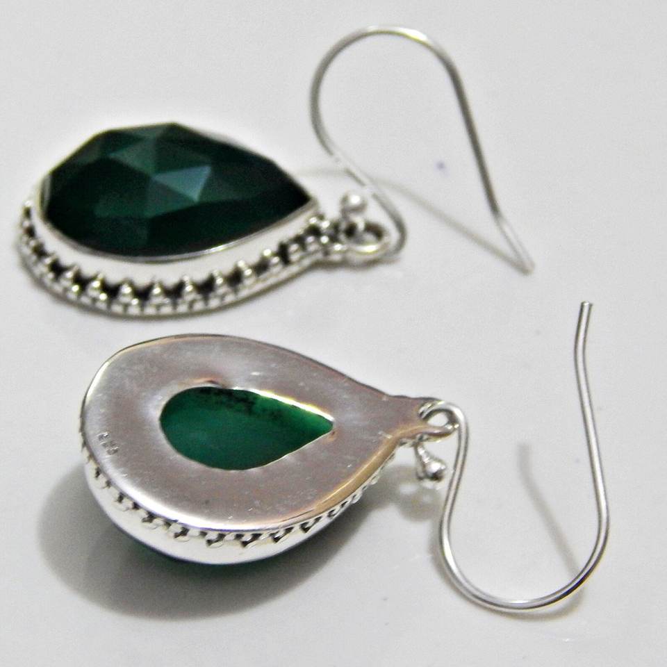925 Sterling Silver Green Onyx Earring Vintage Faceted Gemstone Lightweight Wedding Gift for Her