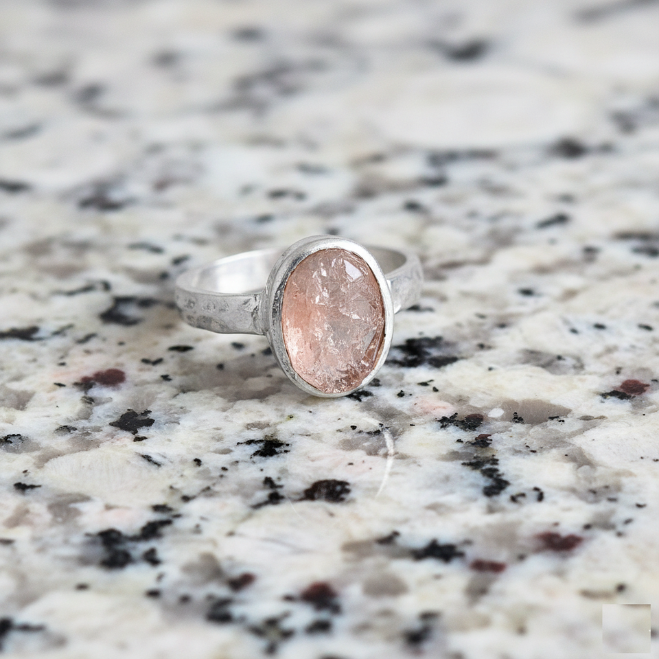 925 Sterling Silver Hammered Bezel Set Natural Rose Quartz Ring