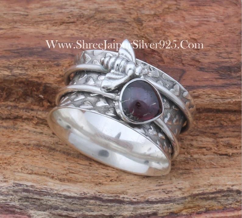 925 Sterling Silver Heart Engraved Garnet Pear Shape Bee Spinner Ring For Woman Gemstone Ring