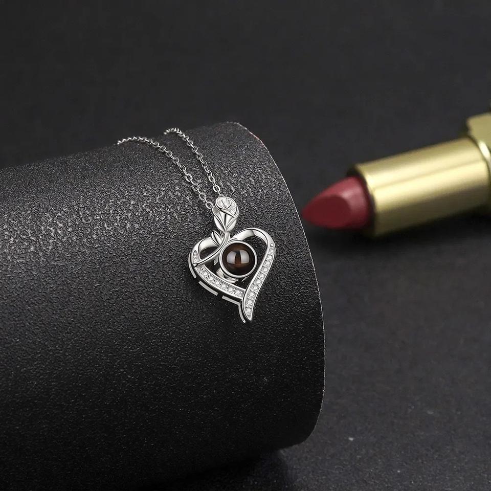 925 Sterling Silver Heart & Rose Projection Necklace 100 Languages Love You Custom Color Photo Engraved Hypoallergenic for Women