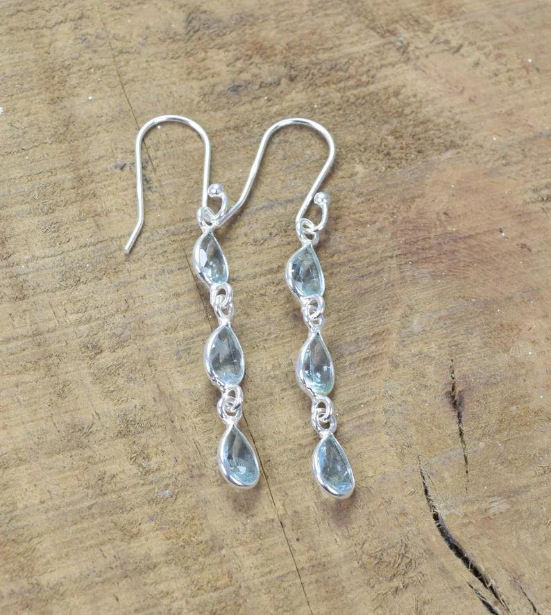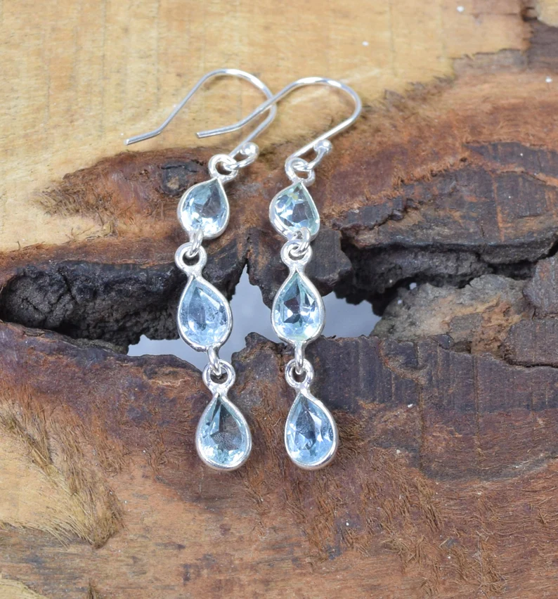 925 Sterling Silver Hook Earring With Natural Blue Topaz Gemstone Handmade 3 Stone Hoop Earrings High Grade Jewelry Gift for Her