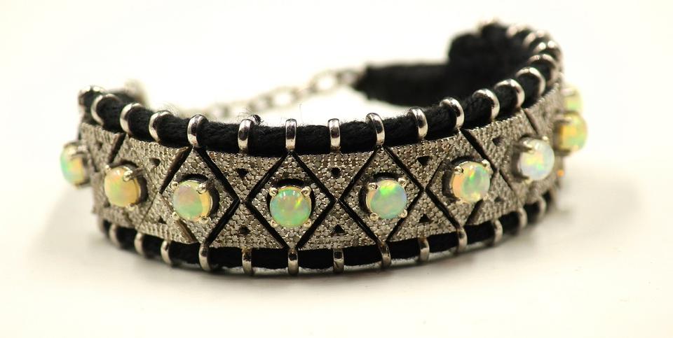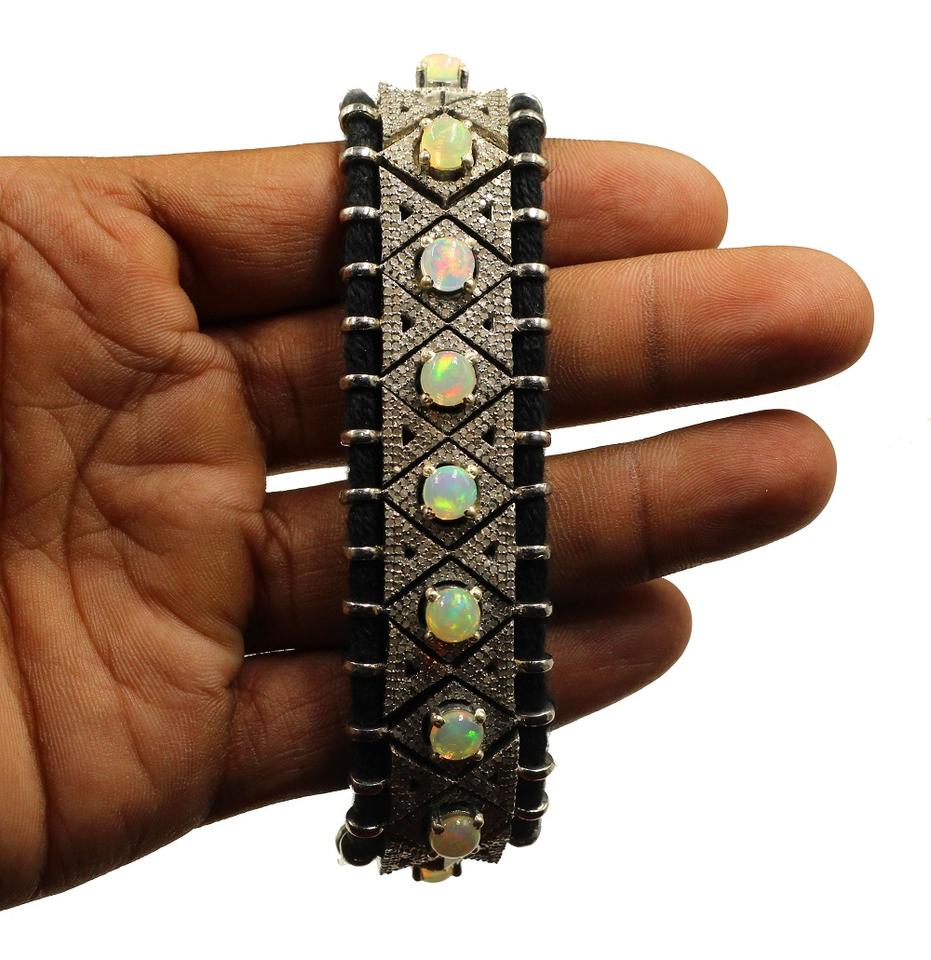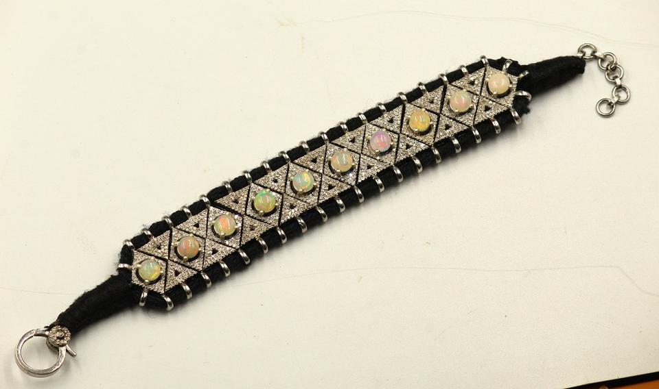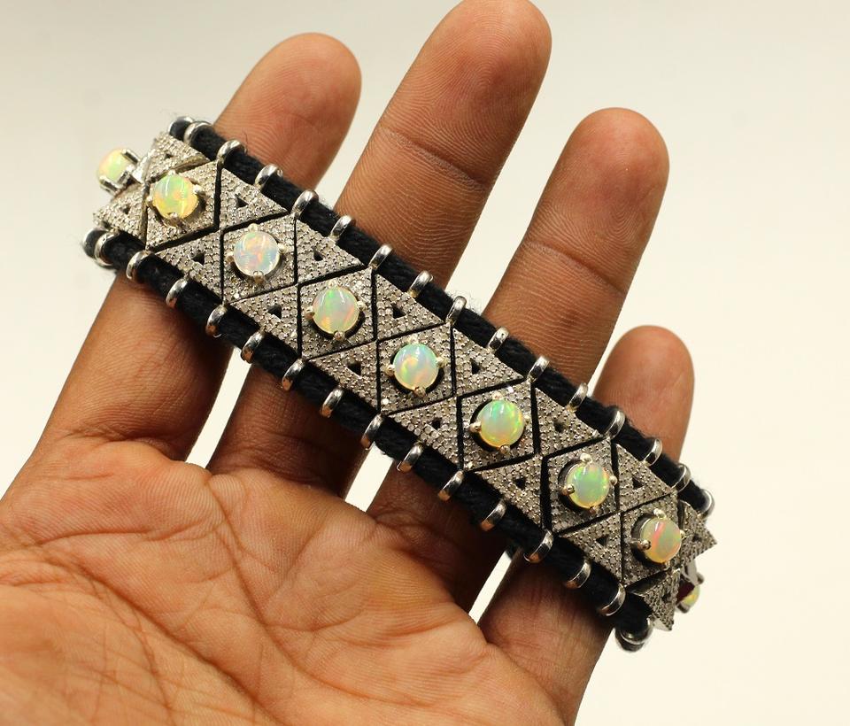 925 Sterling Silver Macrame Bracelet Natural Single Cut Diamond Ethiopian Opal Cabochon Gemstone Vintage Style for Wedding Gift