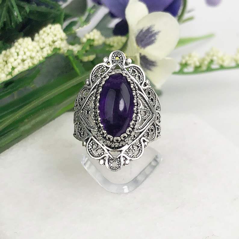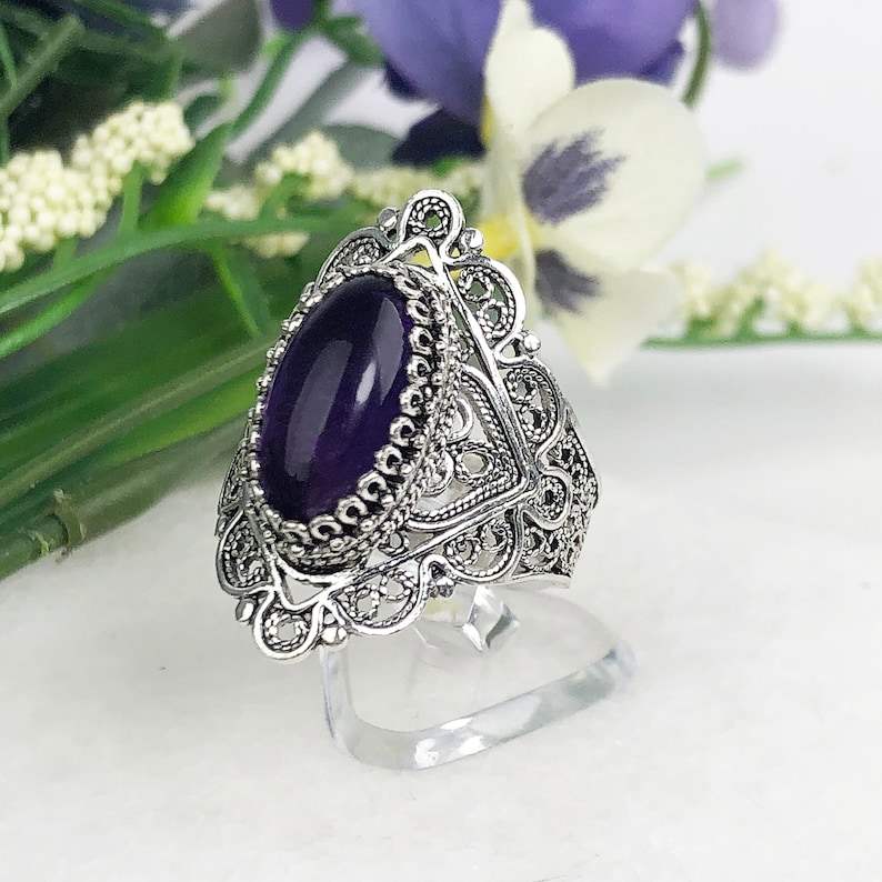 925 Sterling Silver Natural Amethyst Ring Genuine Purple Handmade Artisan Crafted Filigree Oval Statement Jewelry Fine Rings