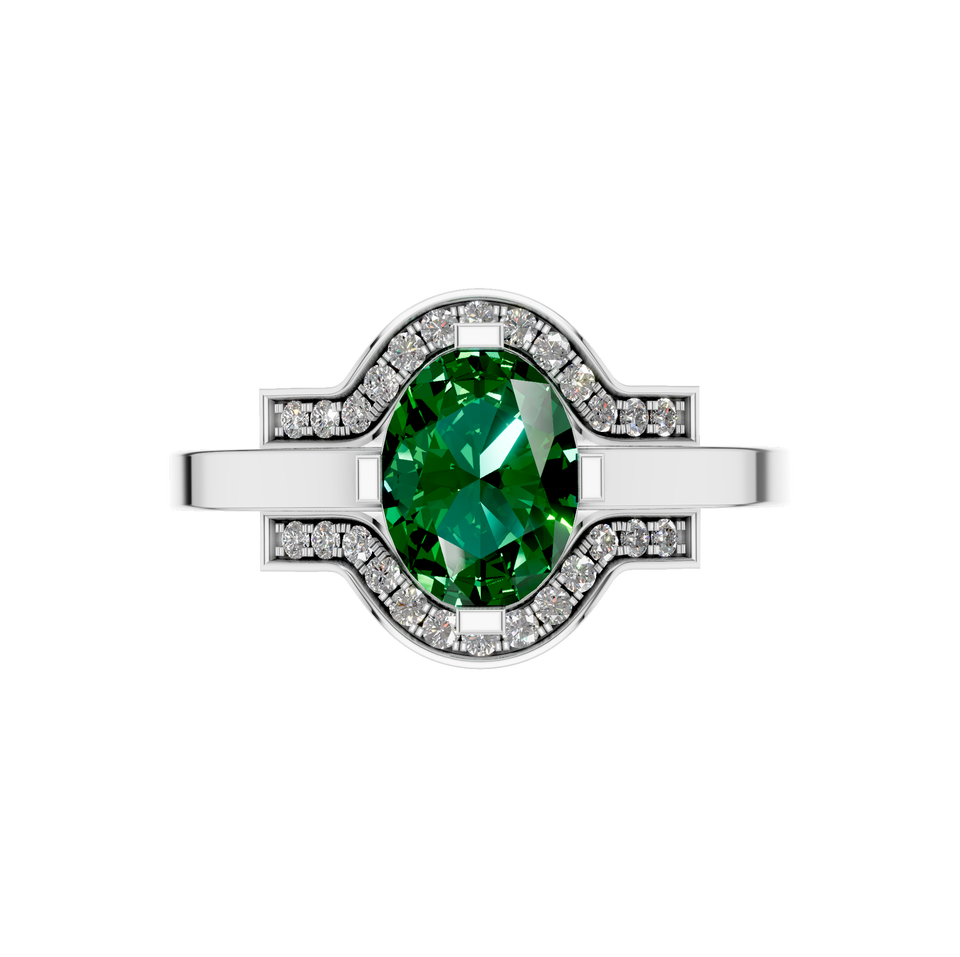 Style:Oval Shaped Emerald Gemstone Ring with Unique Diamond Halo