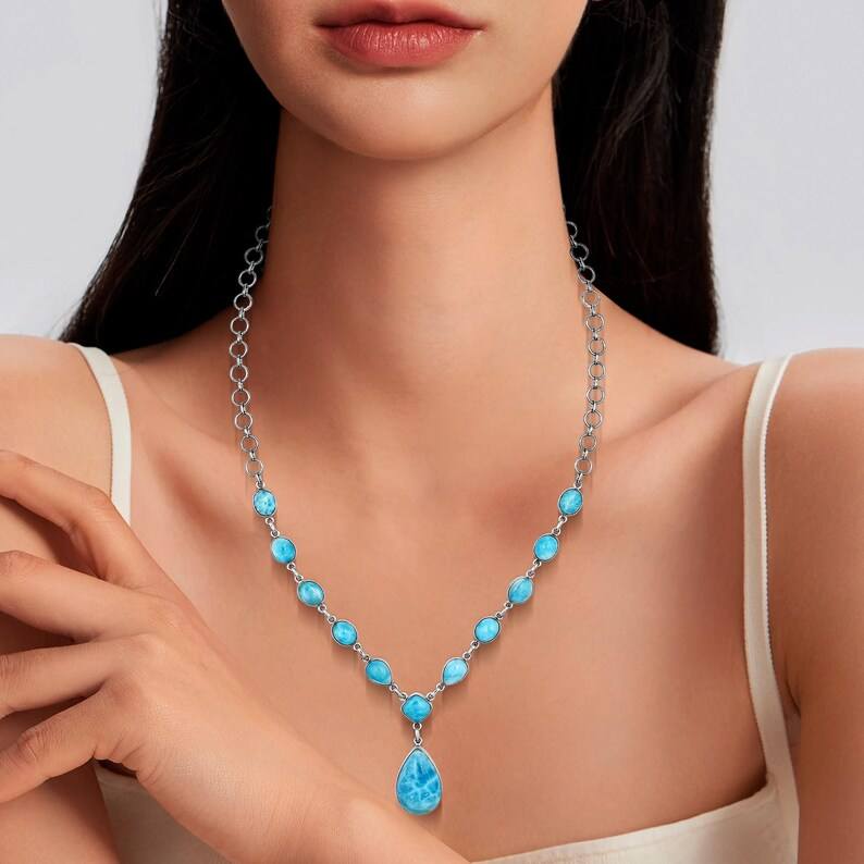 925 Sterling Silver Natural Dominican Larimar Gemstone Necklace Pear Drop Pendant Jewelry March Birthstone Gift