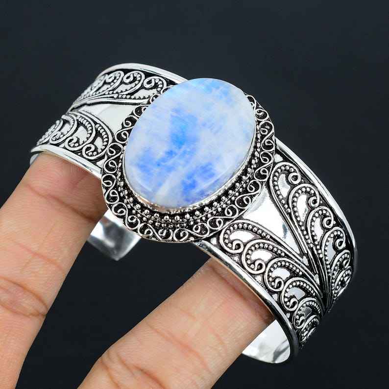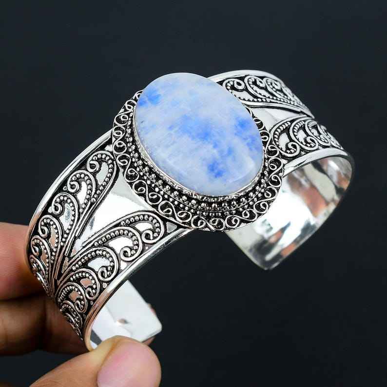 925 Sterling Silver Natural Excellent Quality Rainbow Moonstone Gemstone Handmade Designer Adjustable Bangle For Women Customize