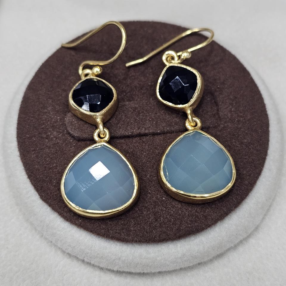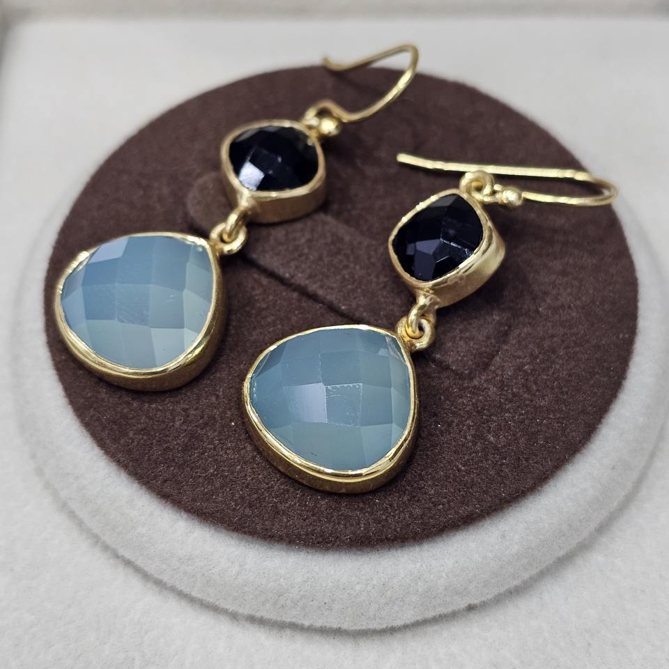 925 Sterling Silver Natural Gold Plated HeartShape Aqua Chalcedony And Cushion Cut Black Onyx Gemstone Handmade Dangling Earring