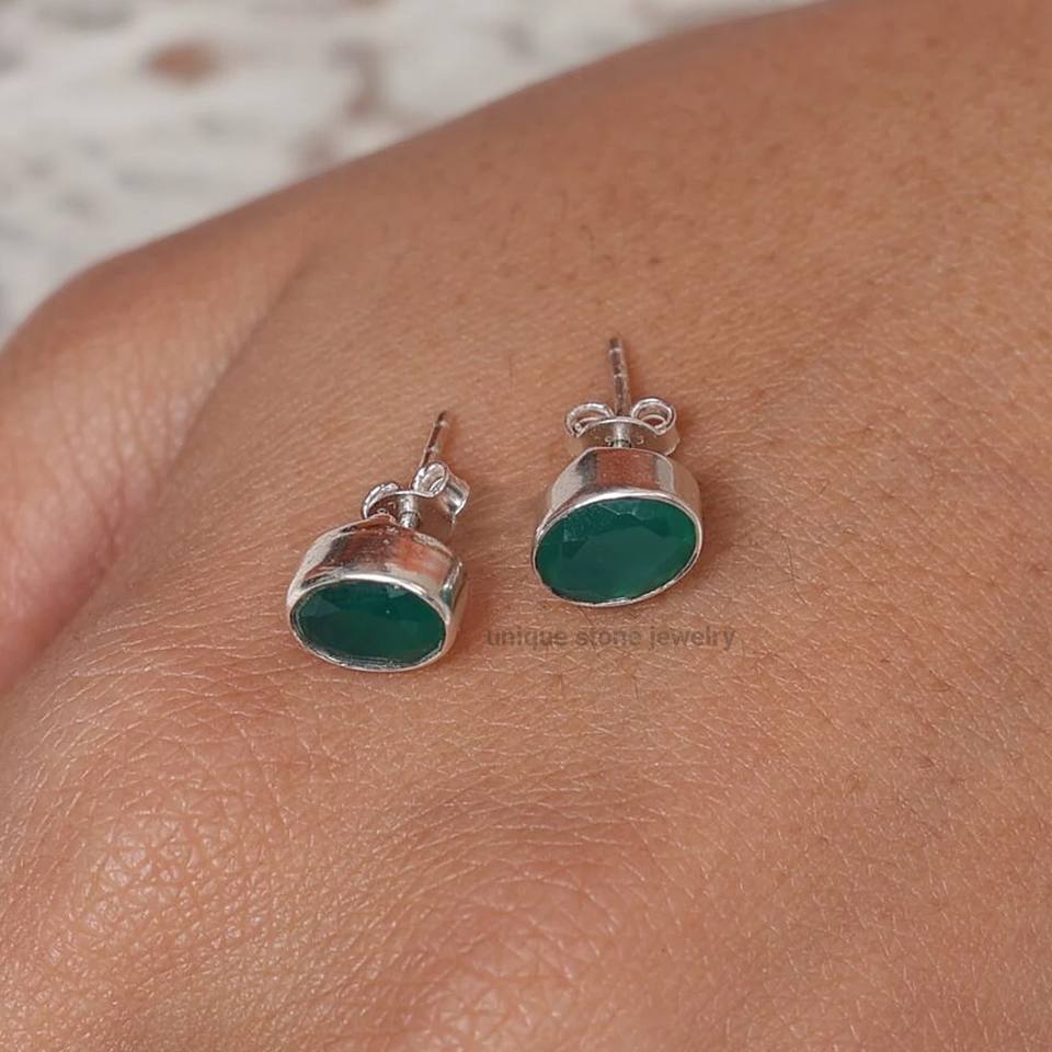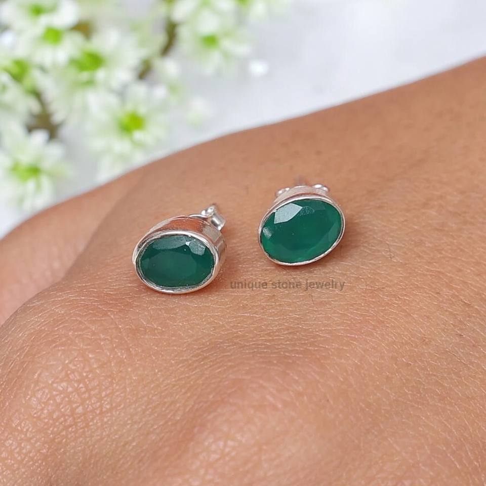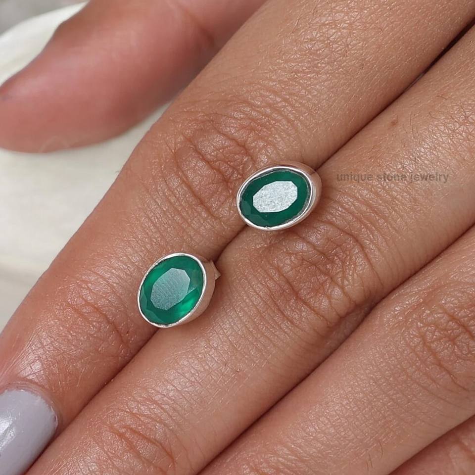 925 Sterling Silver Natural Green Onyx Stud Earrings Handmade Faceted Gemstone Jewelry Gold Plating Statement Piece for Women