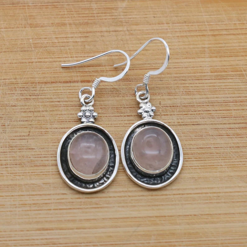 925 Sterling Silver Boho Drop Dangle Earrings New Design Rose Quartz Handmade Oval Shaped for Women for Christian Parties