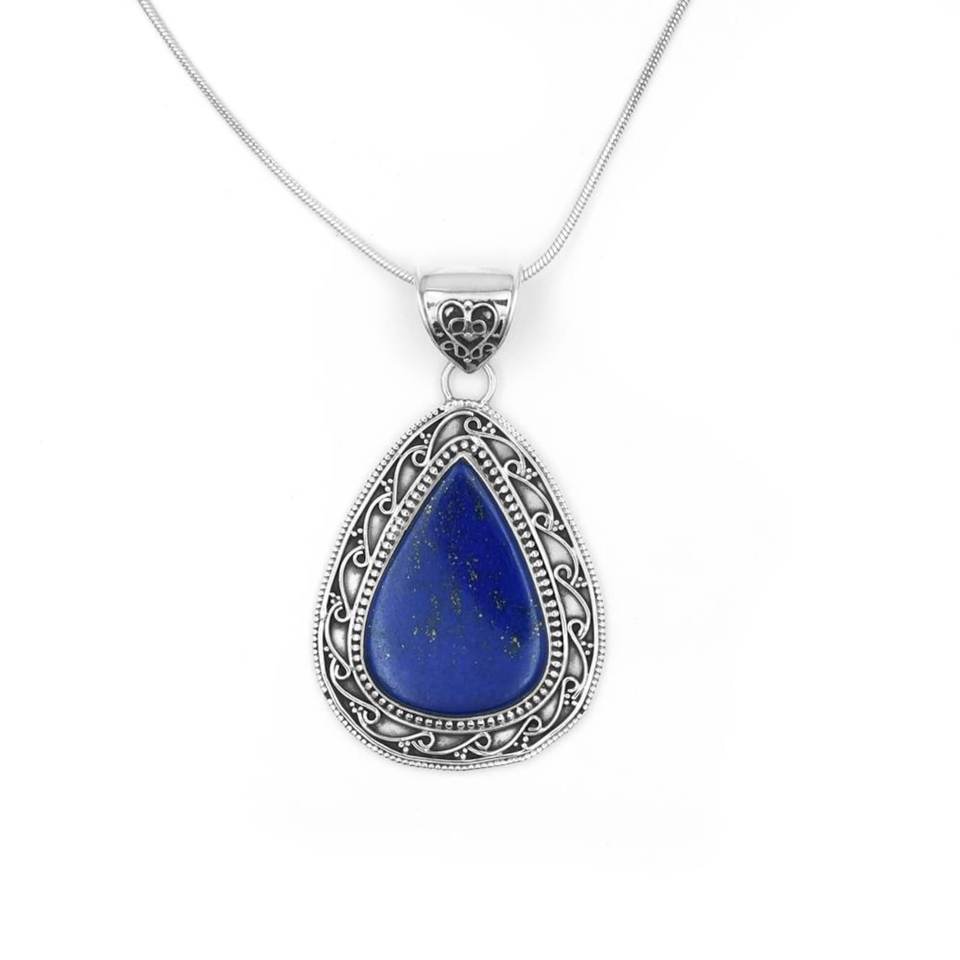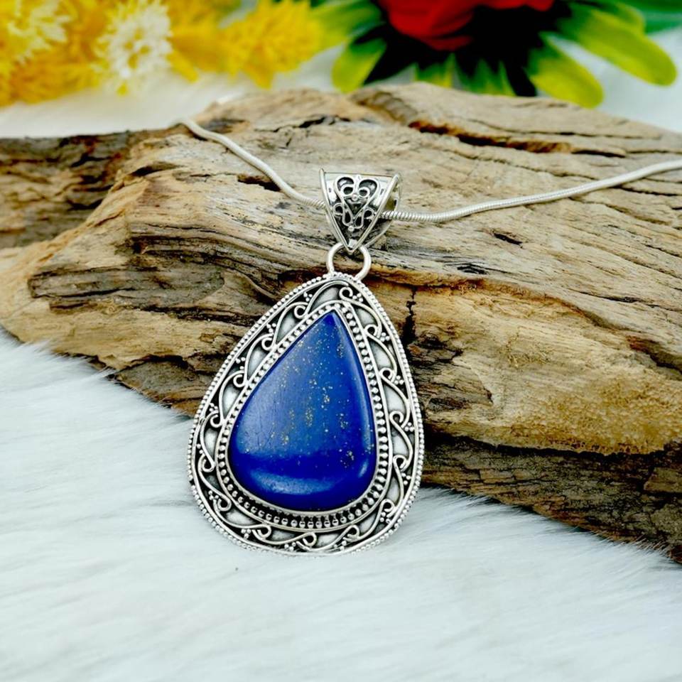 925 Sterling Silver Pendant Necklace Natural Blue Genuine Lapis Lazuli Cabochon Gemstone Vintage Style Trendy Chain Perfect Gift