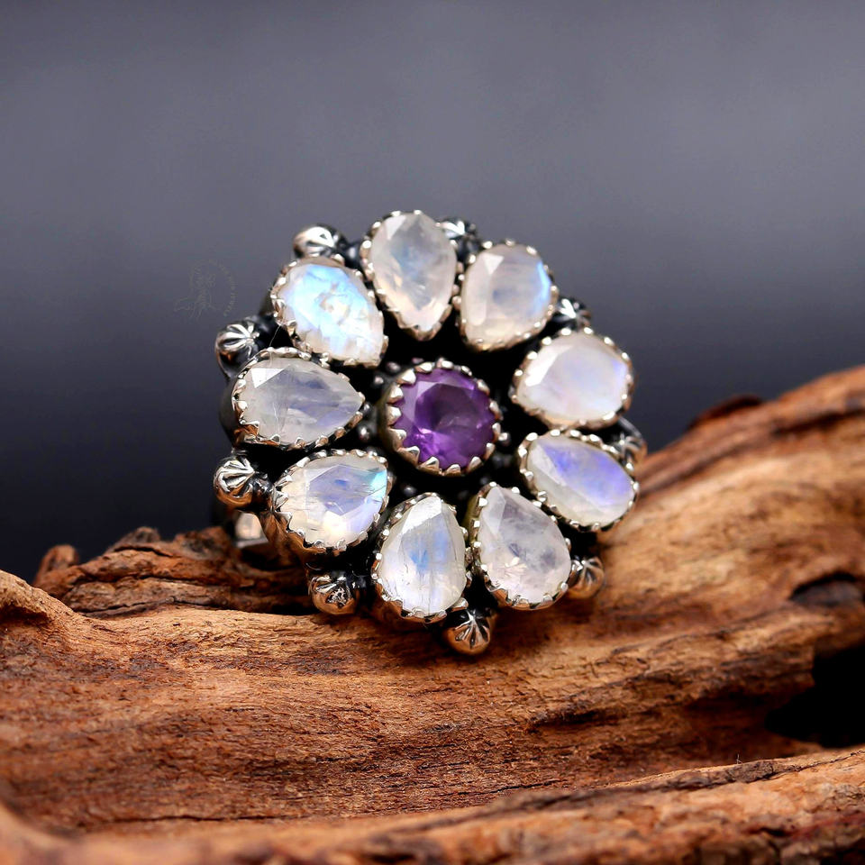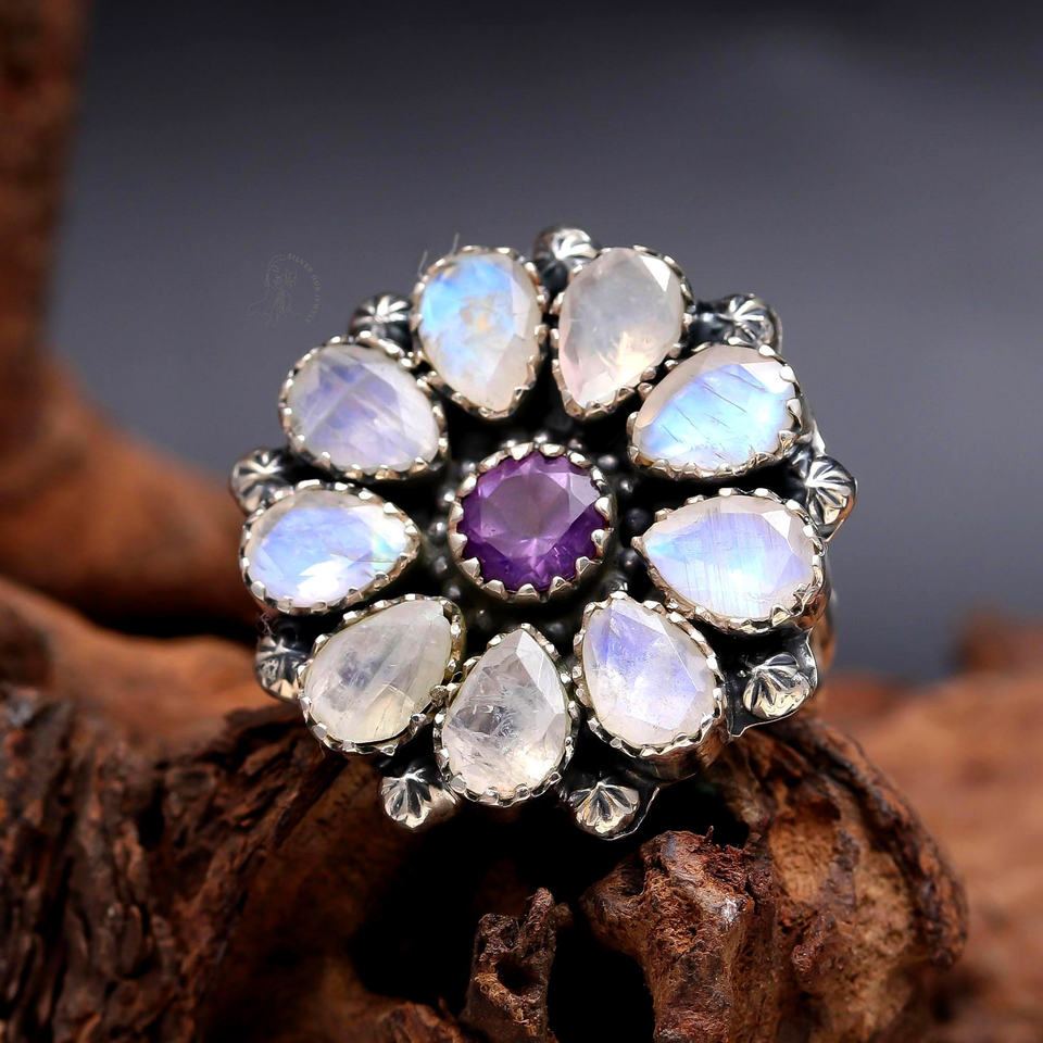 Rainbow Moonstone & Amethyst Solid Silver Statement Ring Jewelry