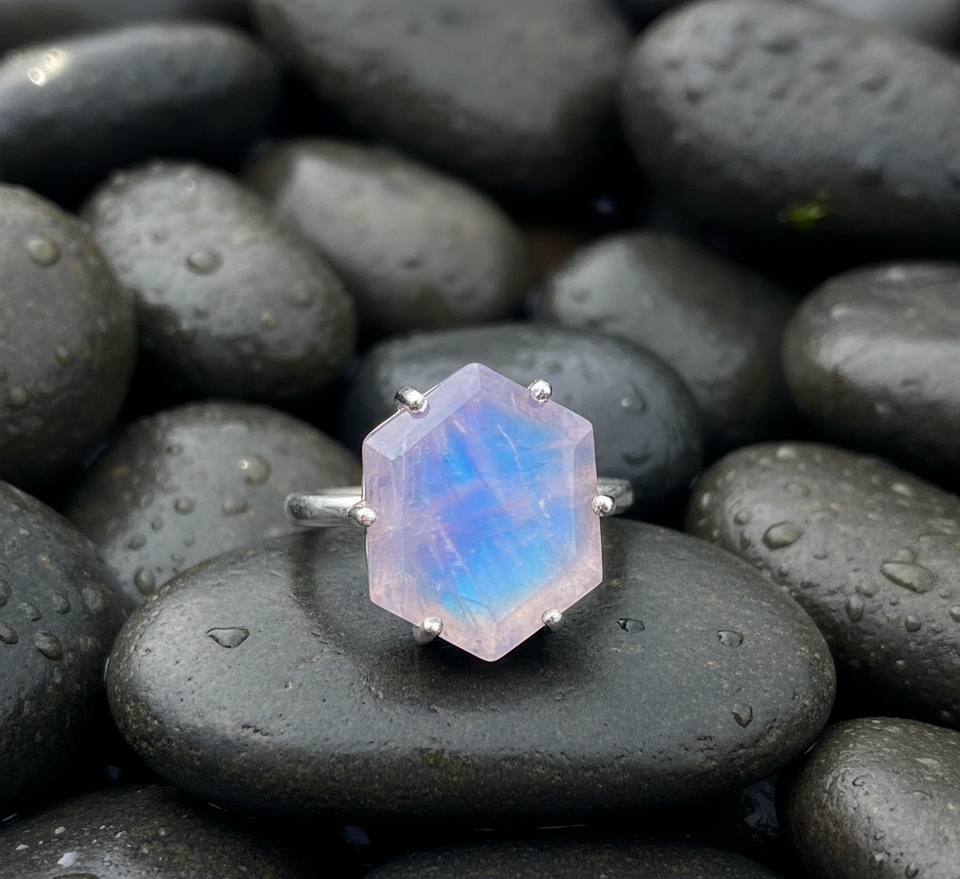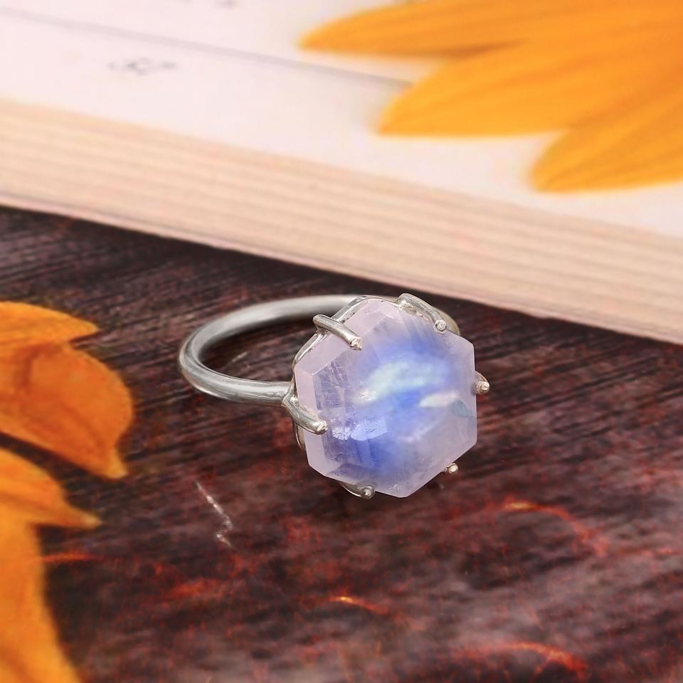 925 Sterling Silver Hexagon Shape Rainbow Moonstone Prong Setting Classic Boho Ring Eternity Birthday Anniversary Gift for Women