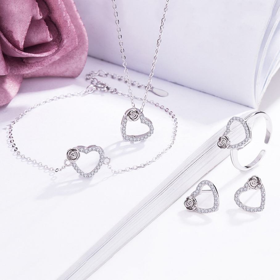 925 Sterling Silver Rhodium Plated Heart Shape Charm Pendants Zircon Earring Bracelet Necklace Jewelry Set