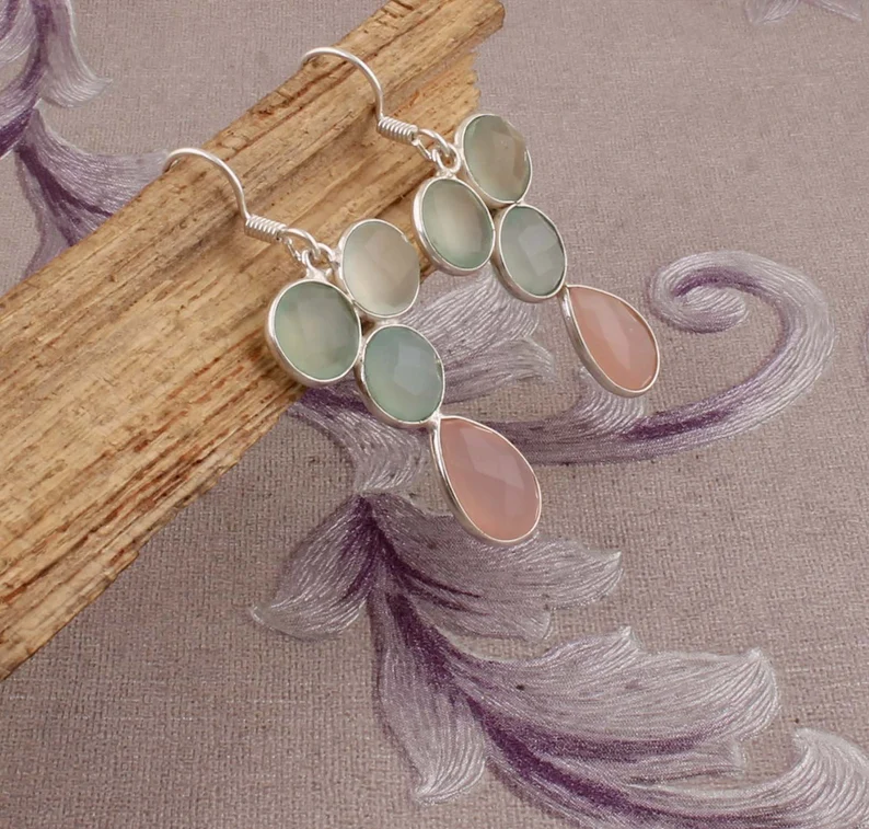 925 Sterling Silver Rhodium Plated Natural Aquacalci & Rose Quartz Hoop Earrings Gift at Factory Price