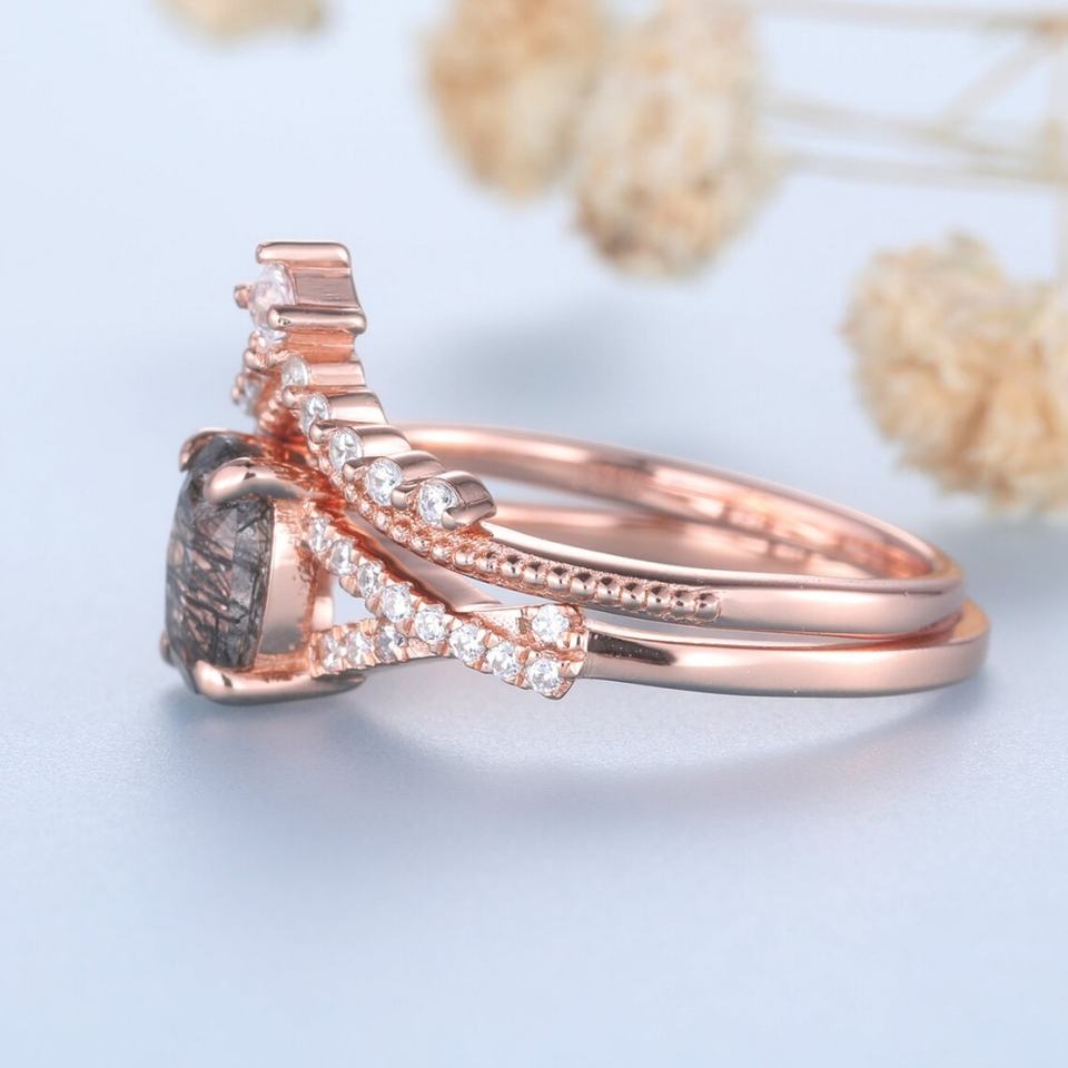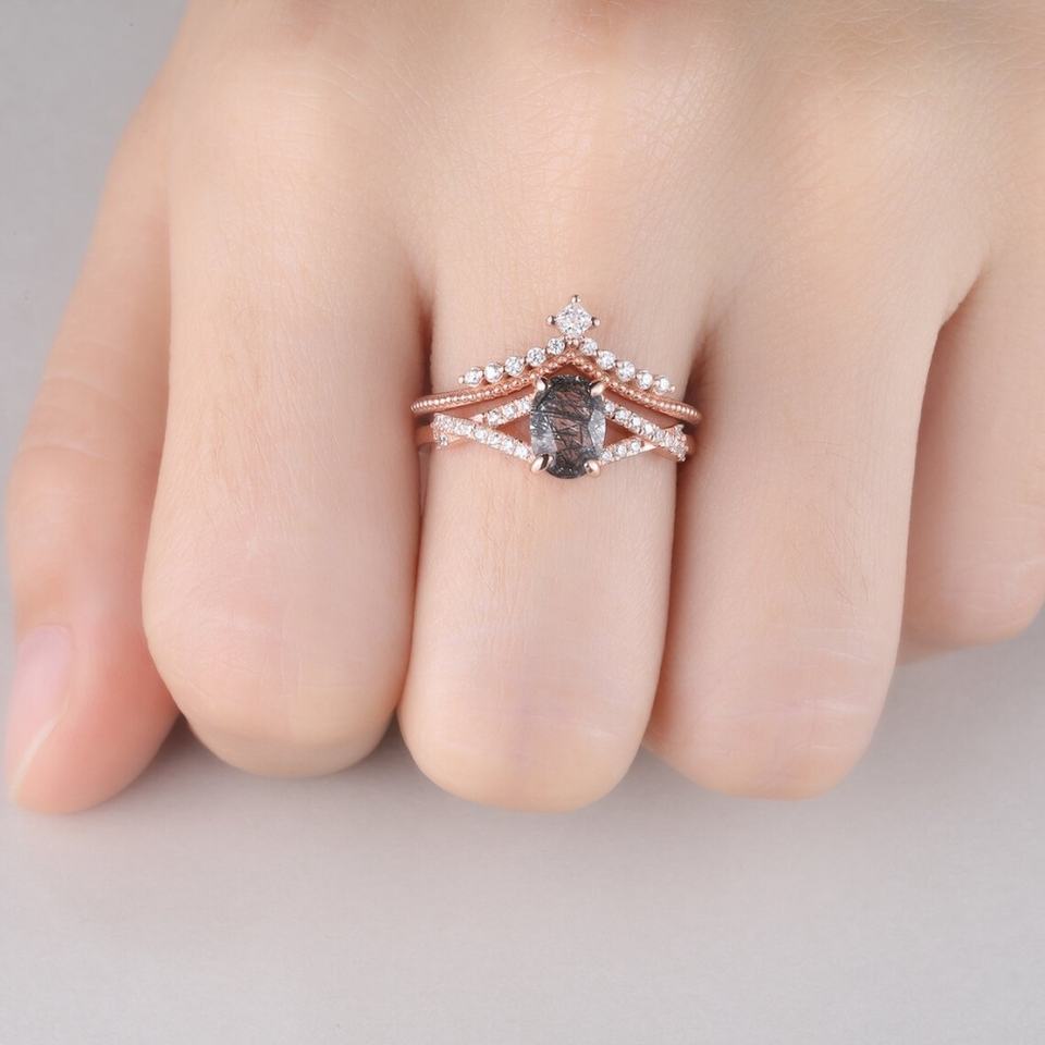 925 Sterling Silver Rose Gold Jewelry Natural Quartz Wedding Band Rings Ring Black Rutilated Ring