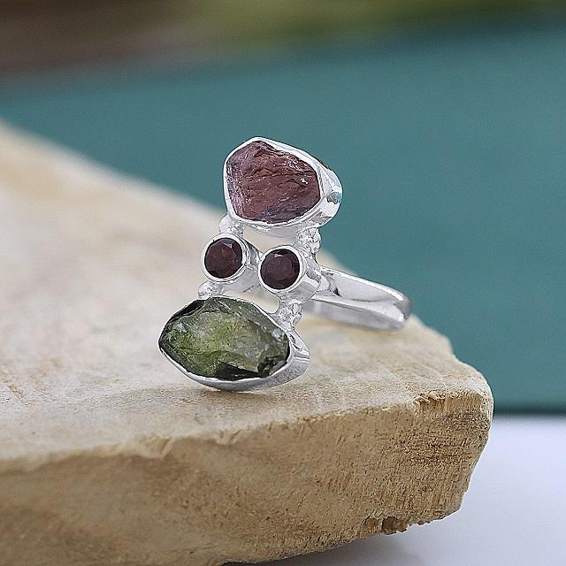 925 Sterling Silver Rough Tourmaline and Garnet Ring Handmade Boho Chunky Raw Crystal Statement Fine Jewelry Manufacturer
