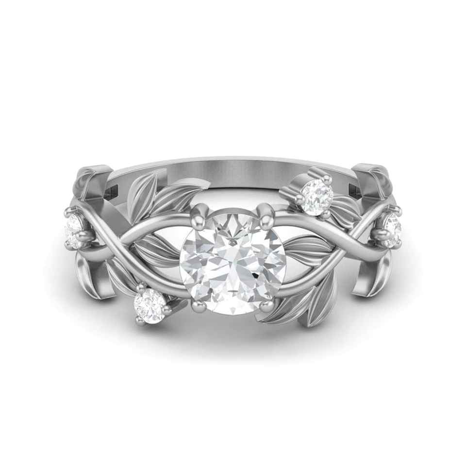 925 Sterling Silver Round VVS MOissanite Diamond Engagement Ring Trendy Leaf and Vine Motif Design Jewelry