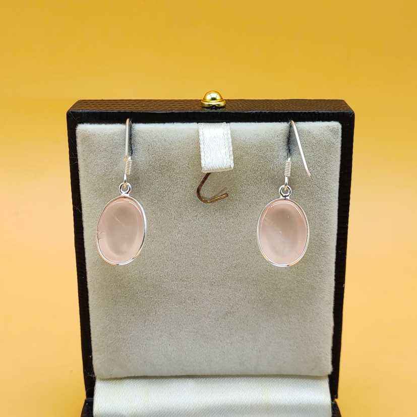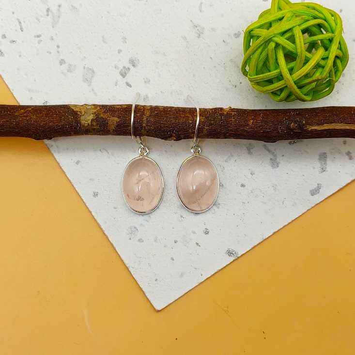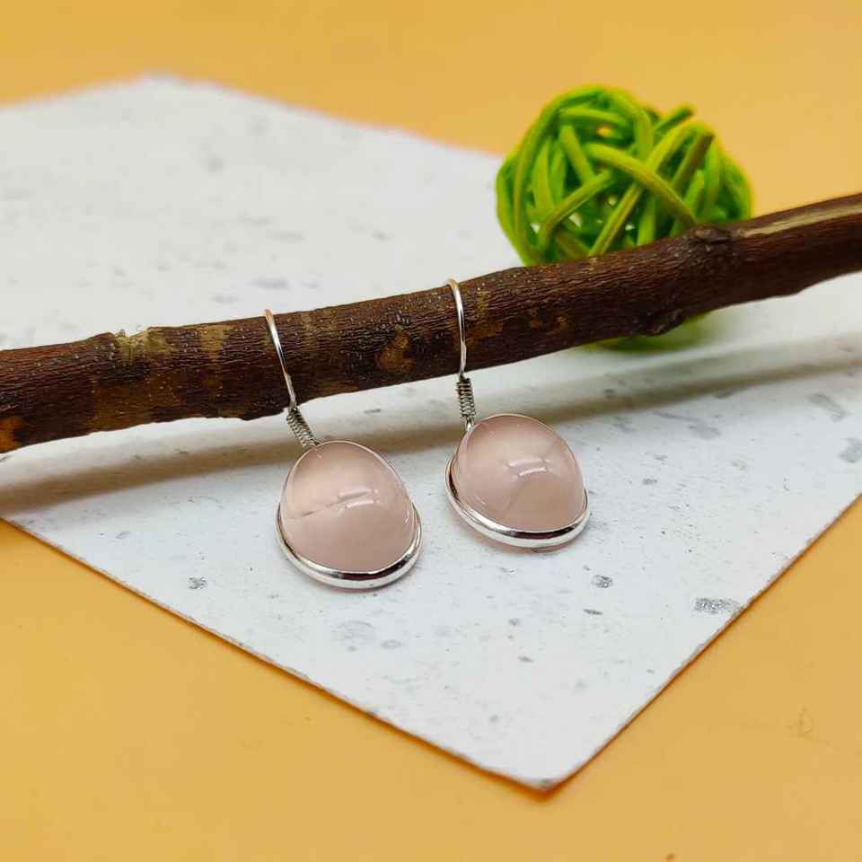 925 Sterling Silver Simple Artisan Crafted Oval Shape Natural Rose Quartz Earring Lightweight Bezel Design Party Diamond Pearl