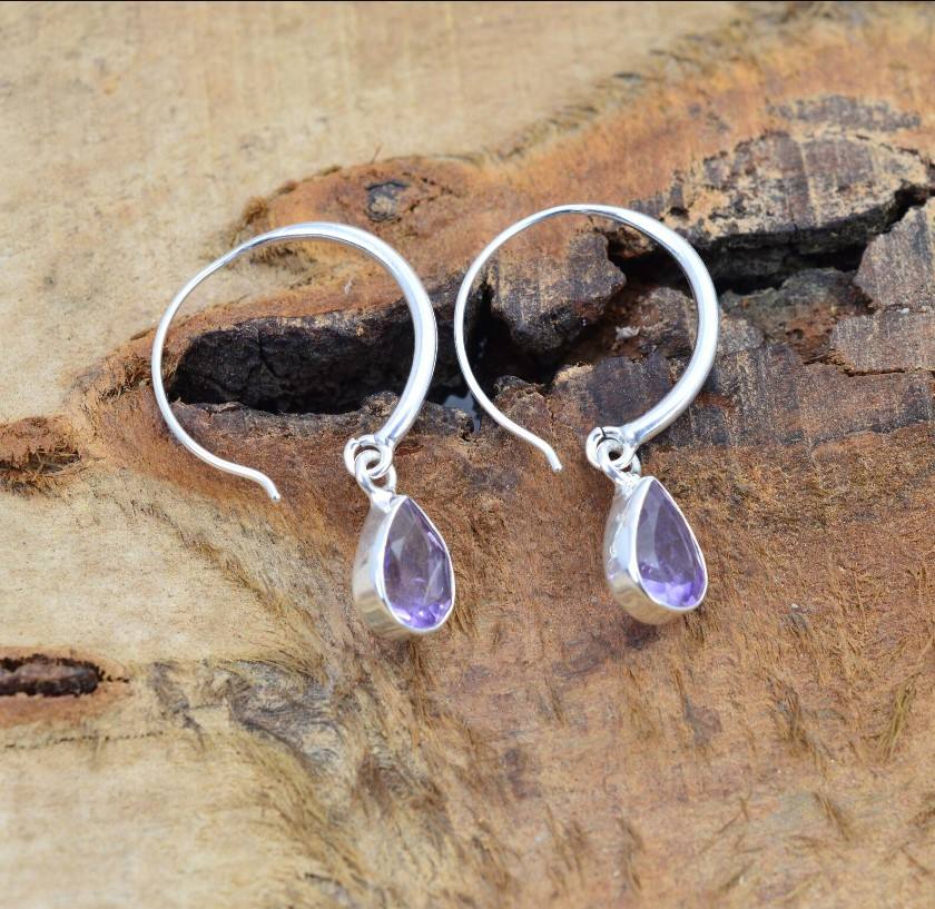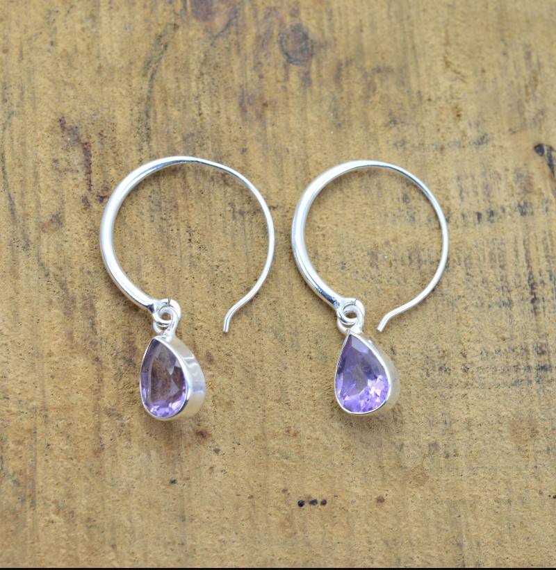 925 Sterling Silver Sparkling Purple Faceted Amethyst Pear Cut Bezel Setting Tiny Minimalist Girls Party wear Dangle Earring