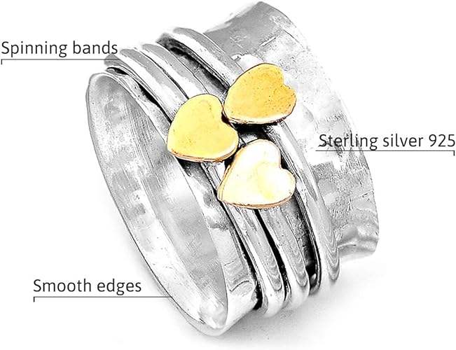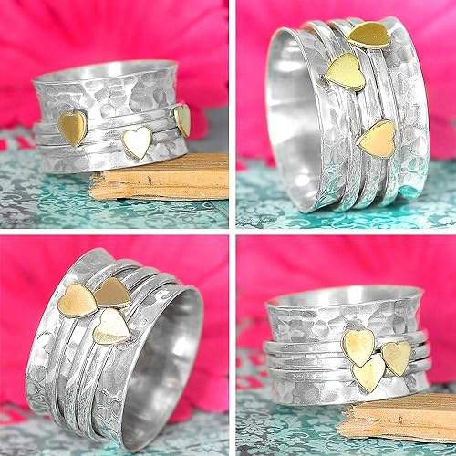925 Sterling Silver Spinner Ring With Brass Heart Accents Handcrafted Fidget Ring Boho Minimalist Jewelry Partywear Gift