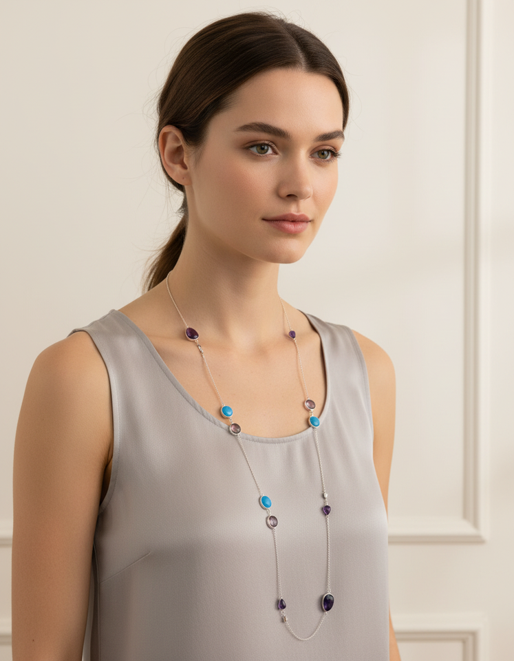 Natural Turquoise Amethyst Tourmaline Multi Beaded Gemstone Necklace 925 Sterling Silver Trendy Statement Party Wear Necklace