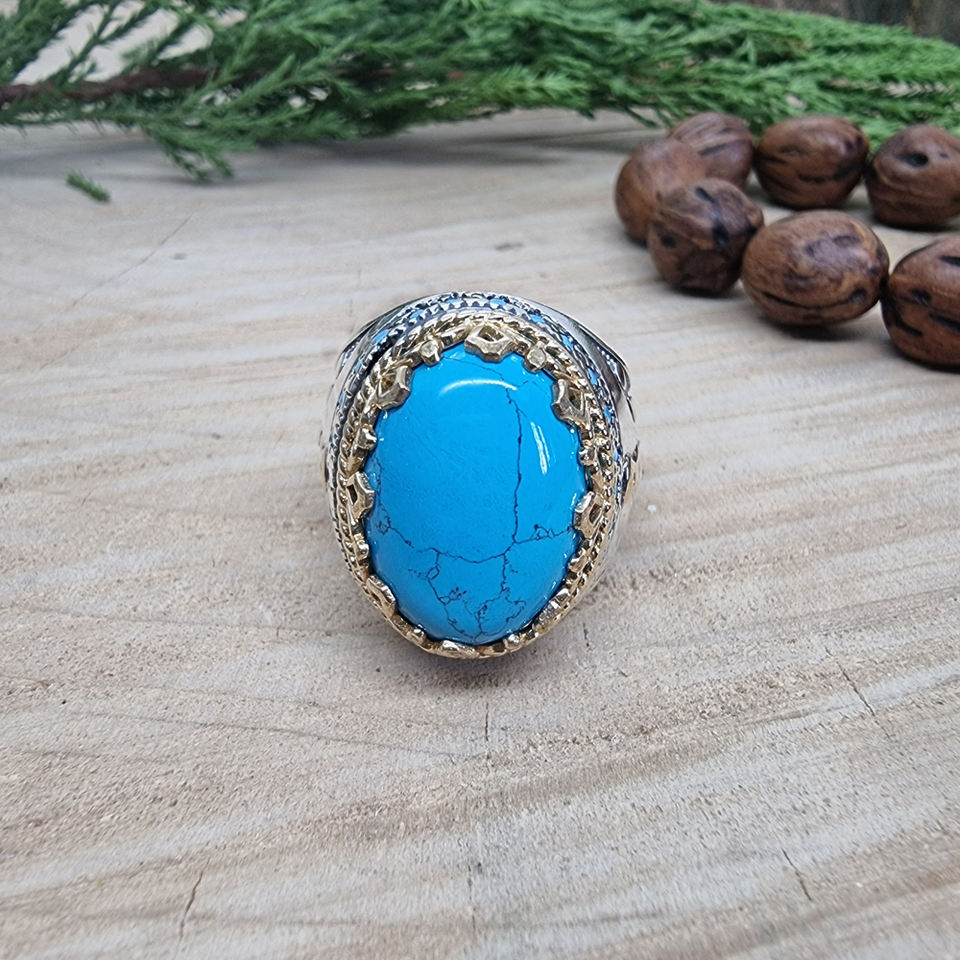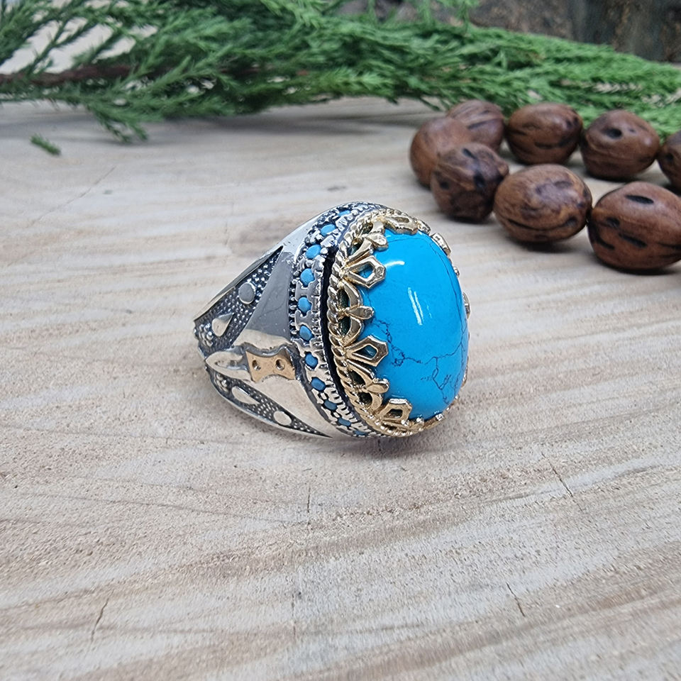 925 Sterling Silver Turkish Handmade Huge Turquoise CZ Stone Men Ring Ottoman Arabic Dagger Sword Ring Accessories Gift for Man