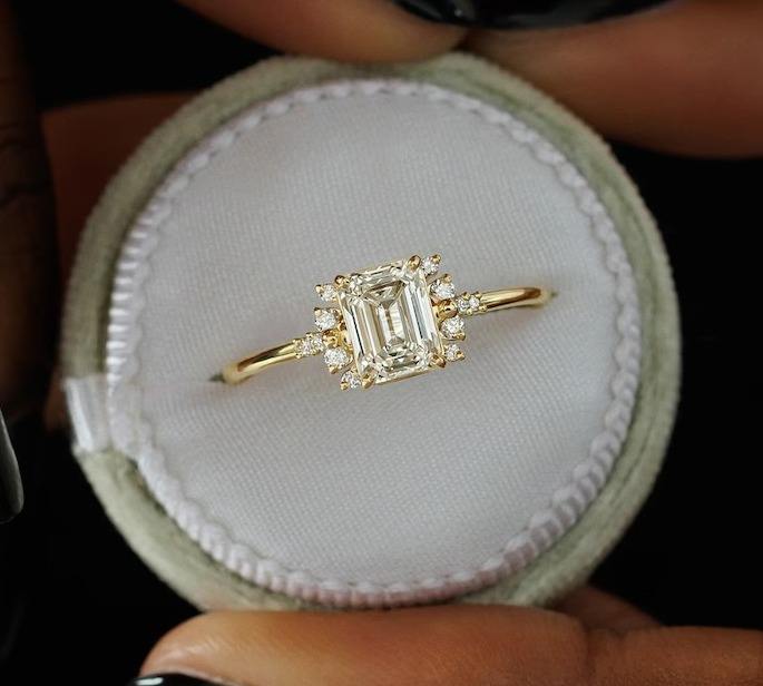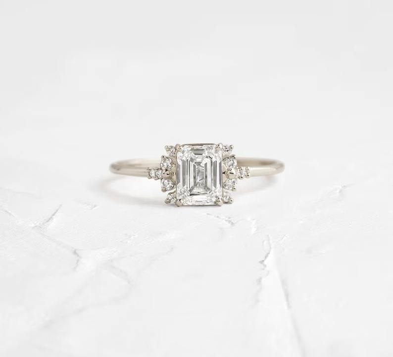 925 Sterling Silver VVS2 Emerald Cut Moissanite Diamond Ring with Cluster Side Stone Setting Engagement Ring Customized Jewelry