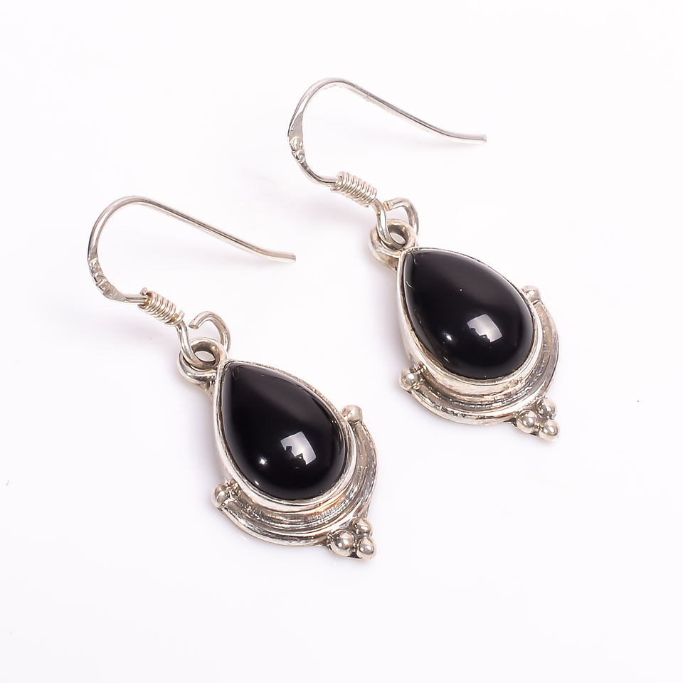 925 Sterling Silver Vintage Style Pear Shaped Black Onyx Earrings Wire Hook Hoop Drop Bezel Setting Gemstone for Engagements