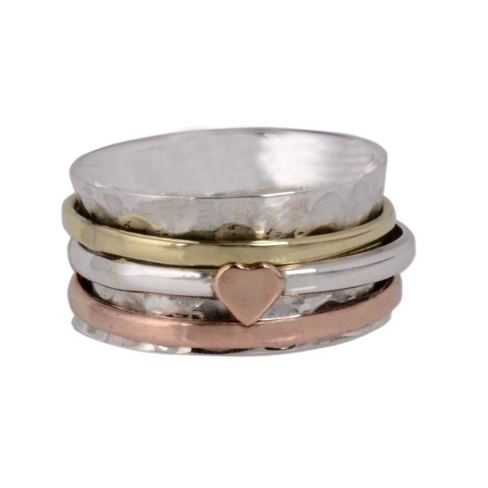 925 Sterling Silver Wide 3-Tone Band Heart Spinner Rings Handmade Statement Jewelry for Parties and Meditation
