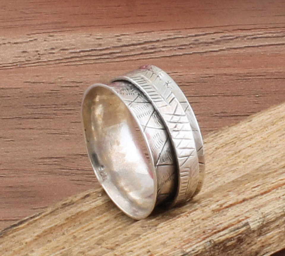 925 Sterling Silver Vintage Wide Band Statement Ring Texture Meditation Handmade Wedding Gift for Women Spinner Ring