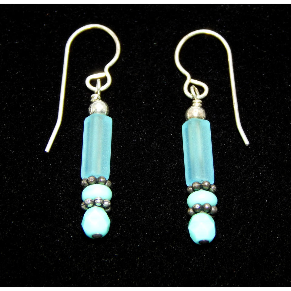 .925 Sterling Silver Wire and Blue Sea Glass with Faceted Stone Earrings