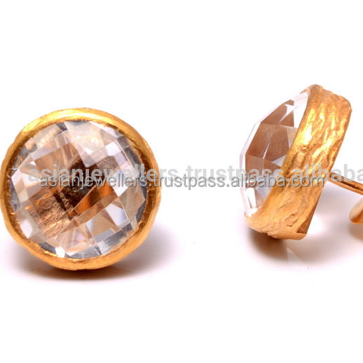 925 sterling silver Crystal Quartz gemstone vermeil Gold stud earrings