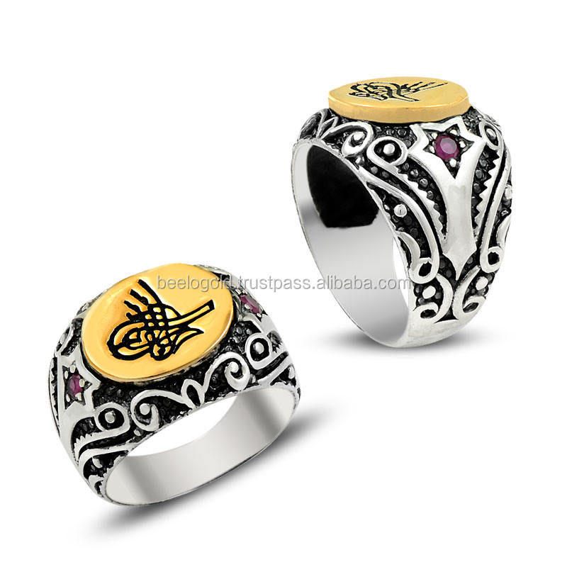 925K Sterling Silver Men's Ring with Zircon Ottoman Tugra Inlay Resizable Gemstone Jewelry for Engagement Gift or Party