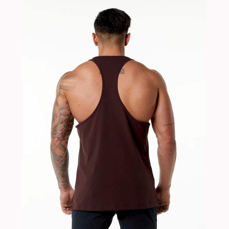 94% Cotton 6% Spandex Relaxed Fit Sweat Wicking Breathable Low Cut Neckline Open Racerback Burgundy Mens Stepped Hem Stringer