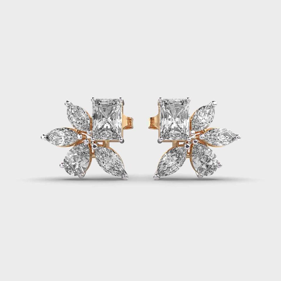 9K White / Rose / Yellow Gold Radiant Cut Diamond Stud Earrings Marquise Floral Cluster Design